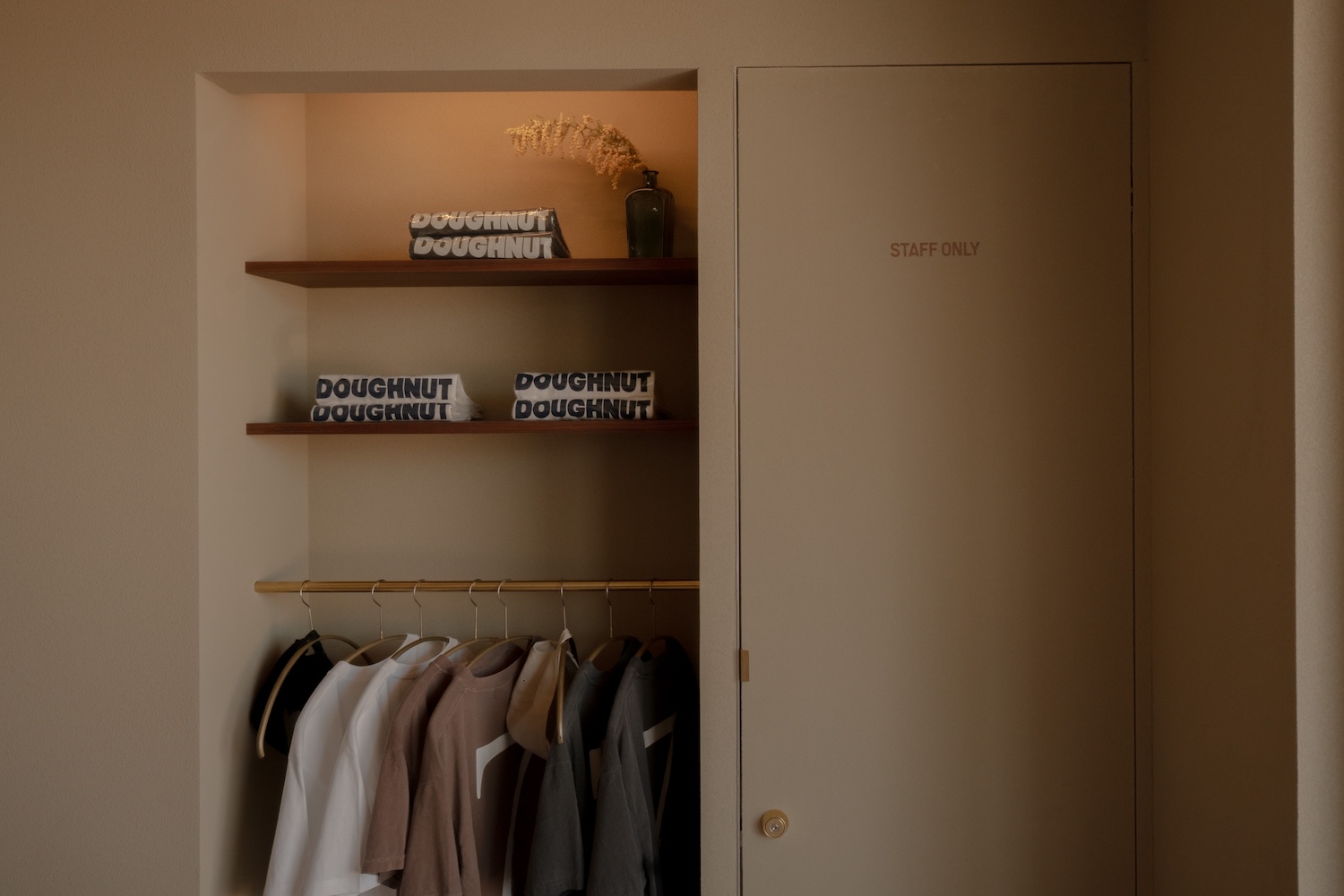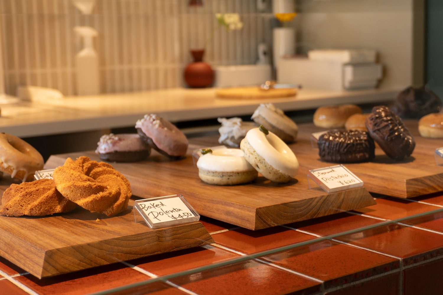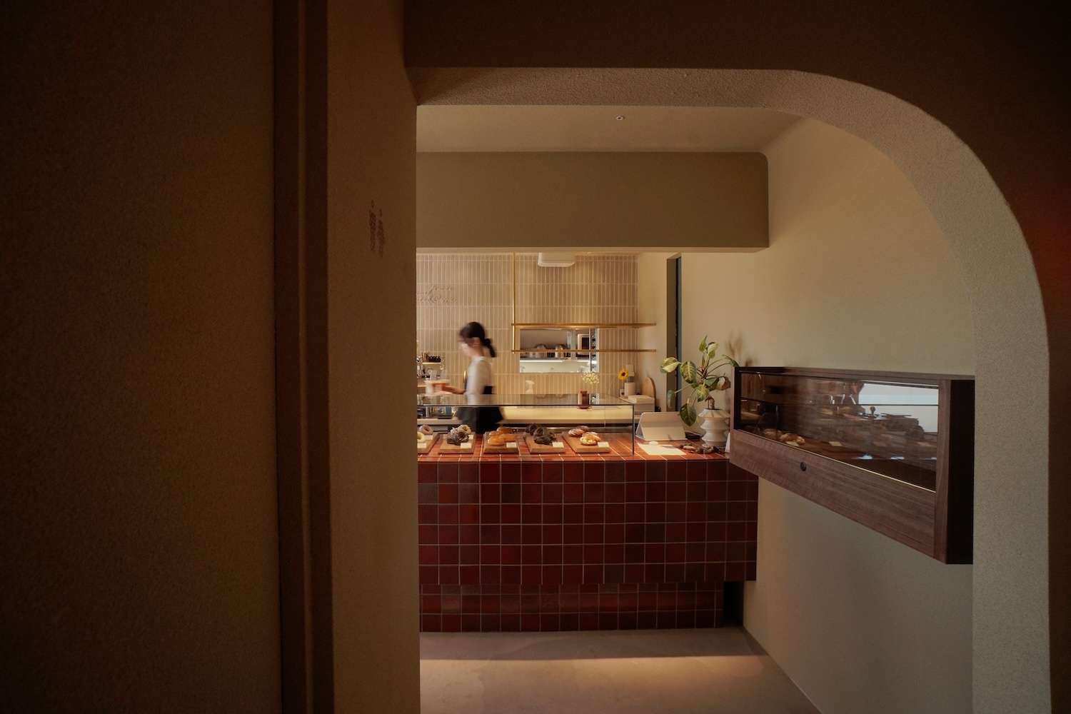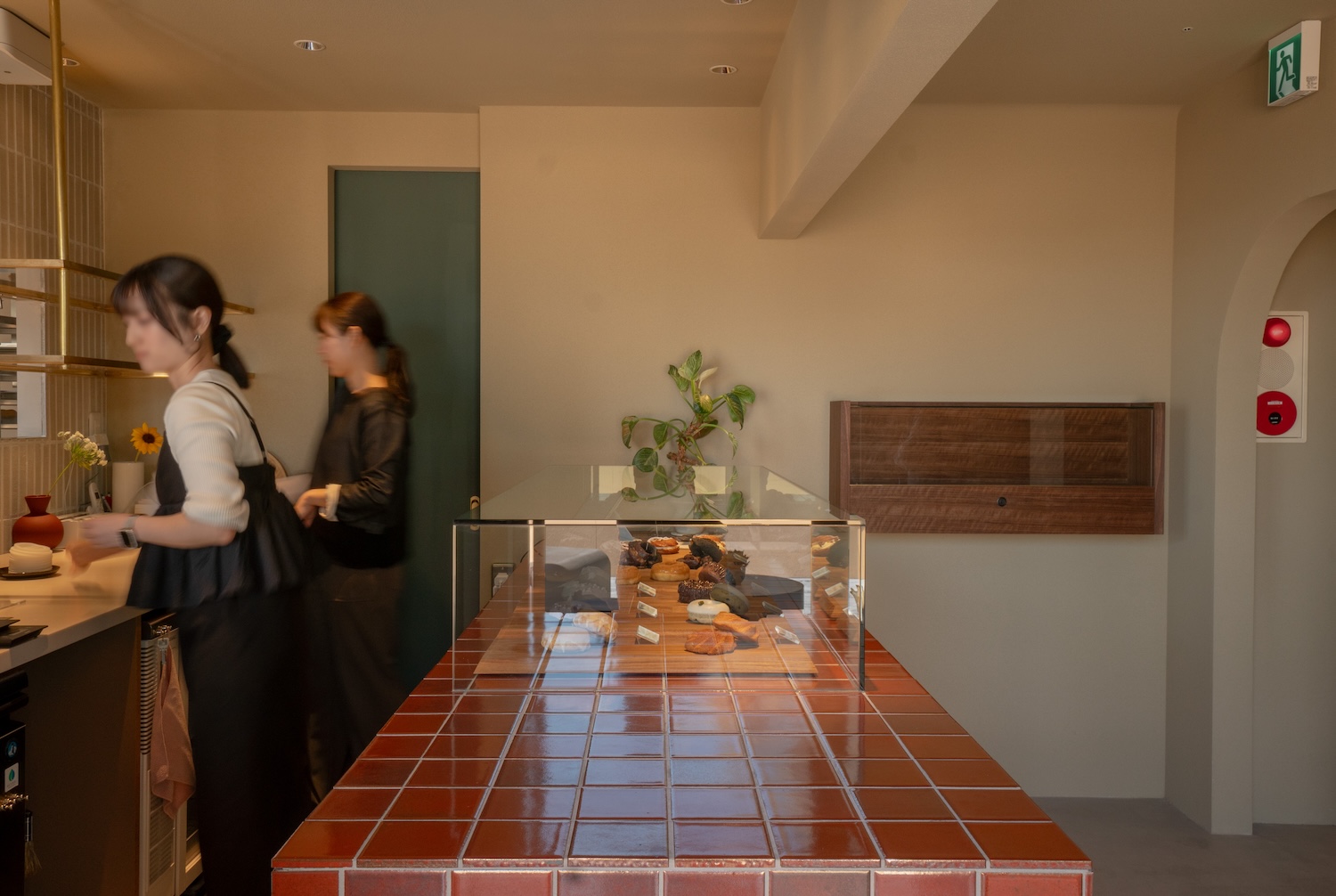 什器や扉面の素材には、赤褐色やモスグリーンのアクセントカラーやタイルなどの異素材を組み合わせることで、間延びしないマテリアル選定を意識した。ショーケースに並ぶ、ひとつひとつに個性が光るドーナツを艶やかなタイルで仕上げたカウンターが、ジュエリーのような特別感を引き出している。