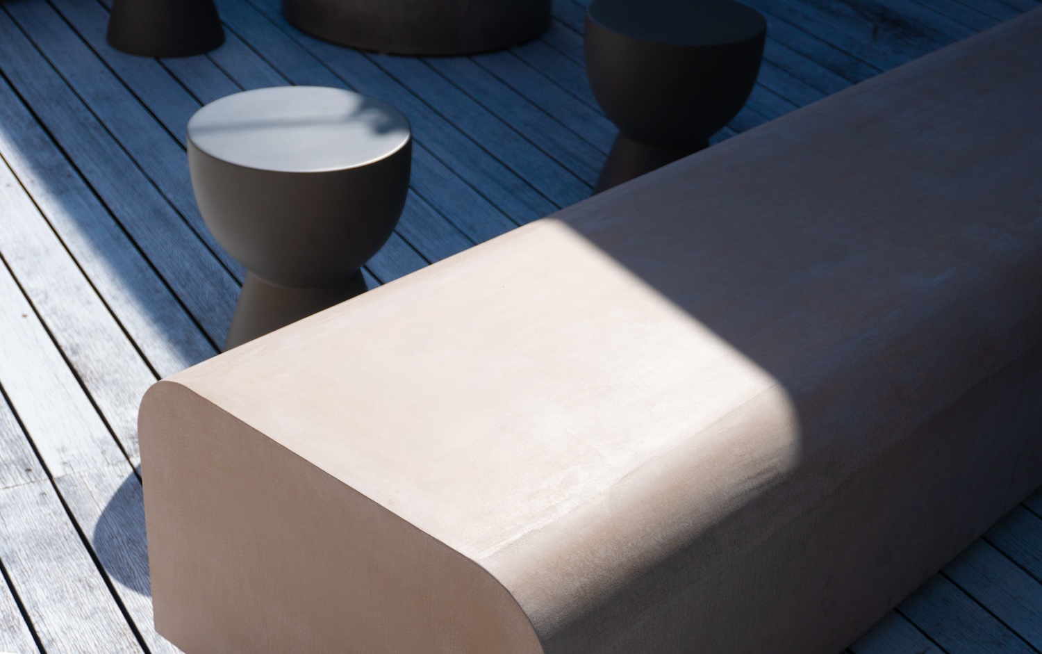 屋外の日差しを受け止めるため、屋内より明るいトーンの仕上げを採用。什器は全体的に高さを低く抑え、眺望を引き立てる構成とした。また、テラスも店内と呼応するように柔らかな曲線を用い、内外がゆるやかにつながる、連続したデザインを意識している。