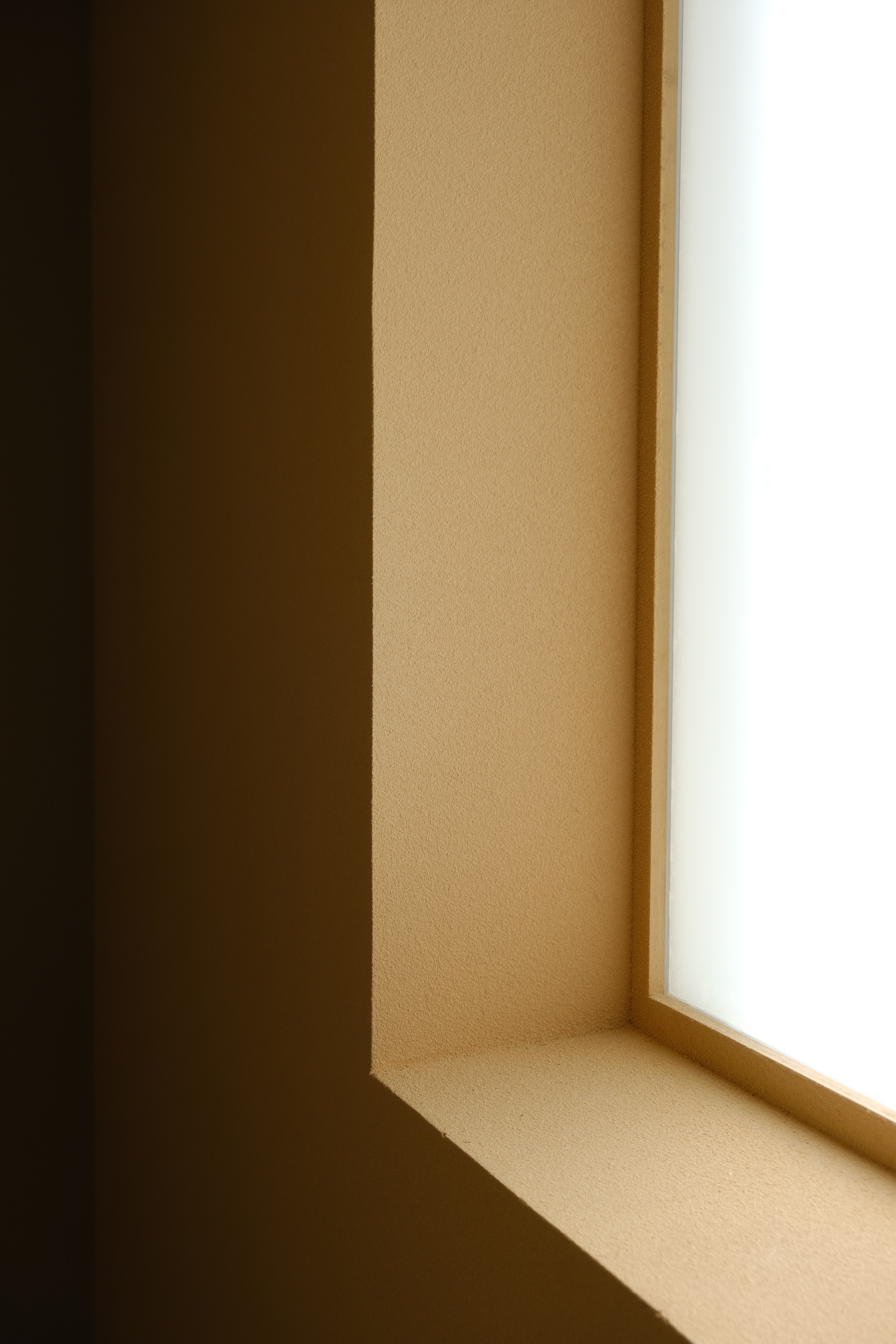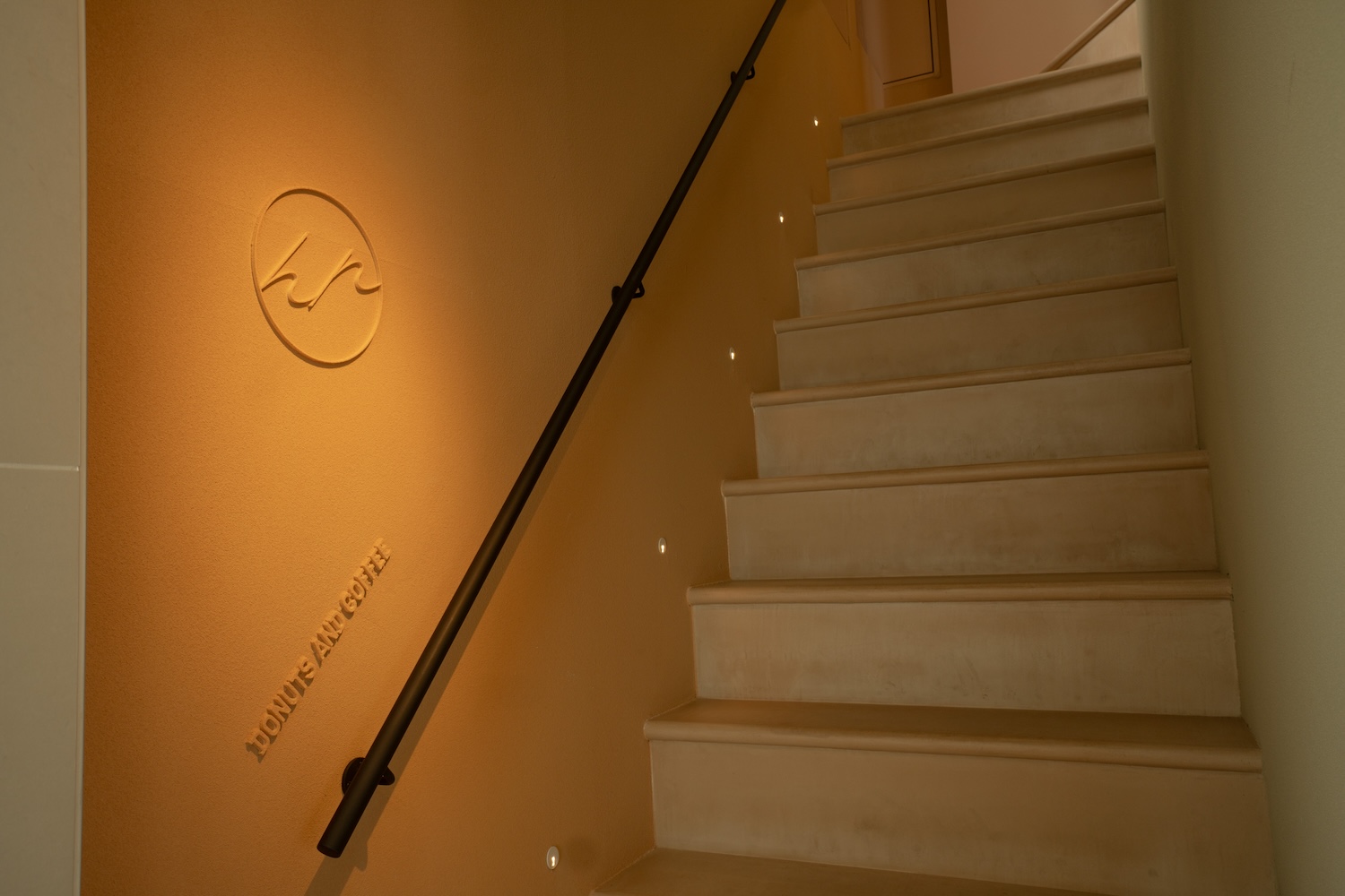 天井高を抑え、包まれるようなスケール感を意識した。メイン仕上げには、落ち着いた色味と質感をもつ左官風塗装を採用し、穴蔵のような温もりと静けさを空間に与えている。照明計画はテラスから差し込む自然光を主役とし、天井設備は客席側には極力設けず最小限に抑えた。また、壁面の角や天井の入隅を柔らかなアールで仕上げることで、自然光の陰影が滑らかに空間に広がるような計画とした。