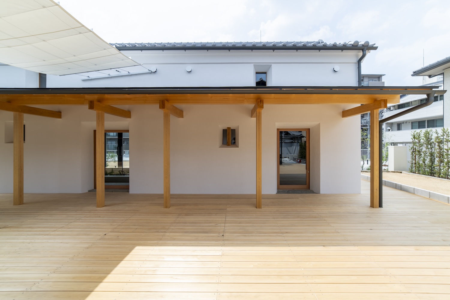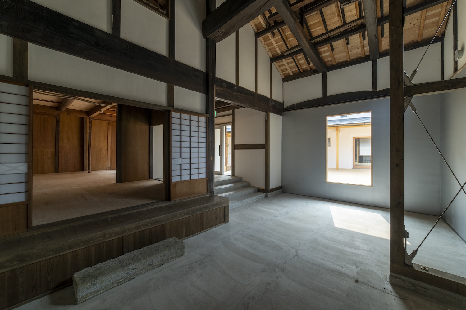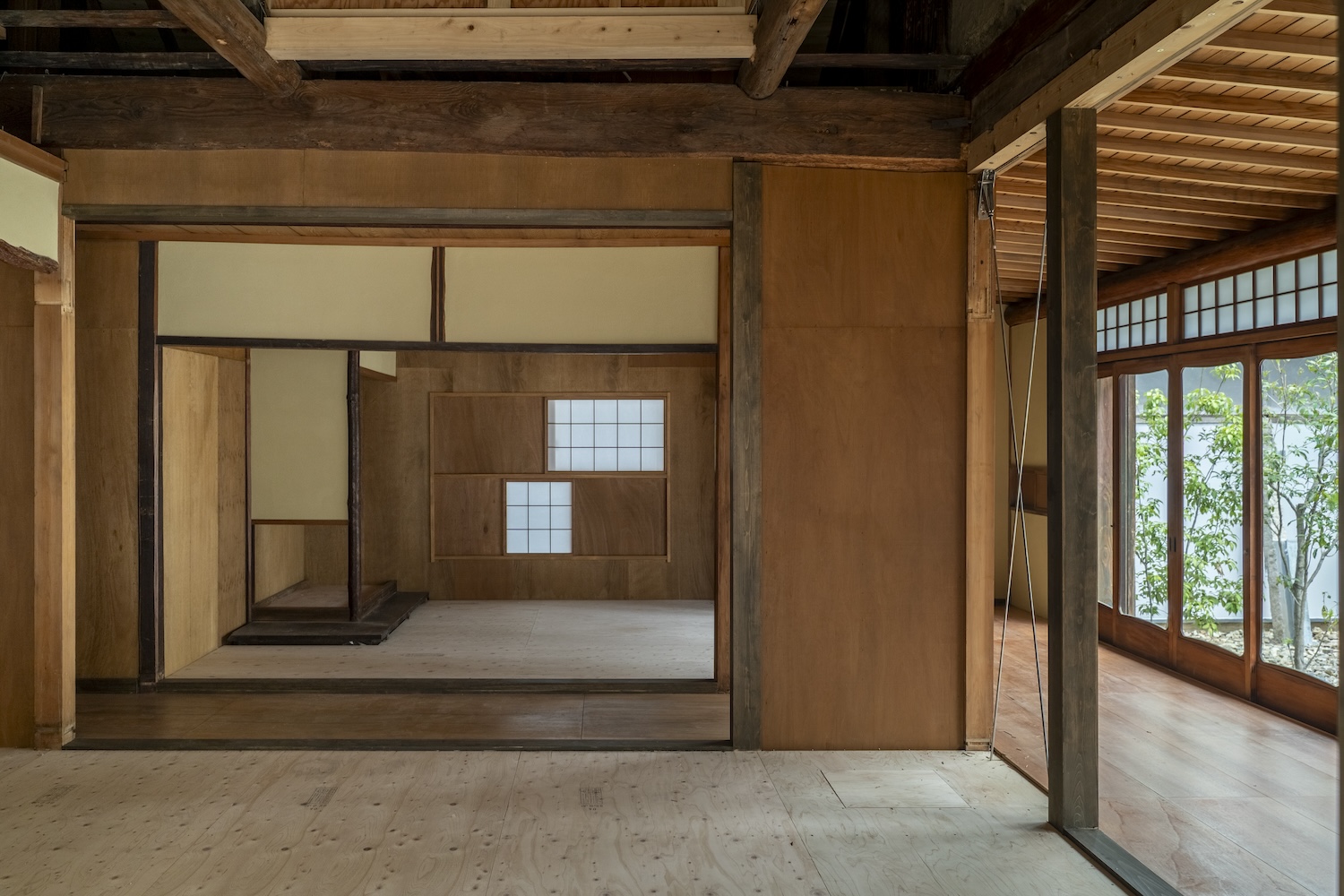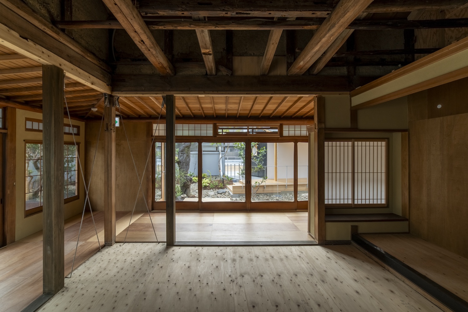 守口宿町家に特有な通し土間の再生や、庭へとつながる広縁の透明感を継承。玄関から土間、庭へと連なる視線の抜け等を新たな空間的価値として付加している。