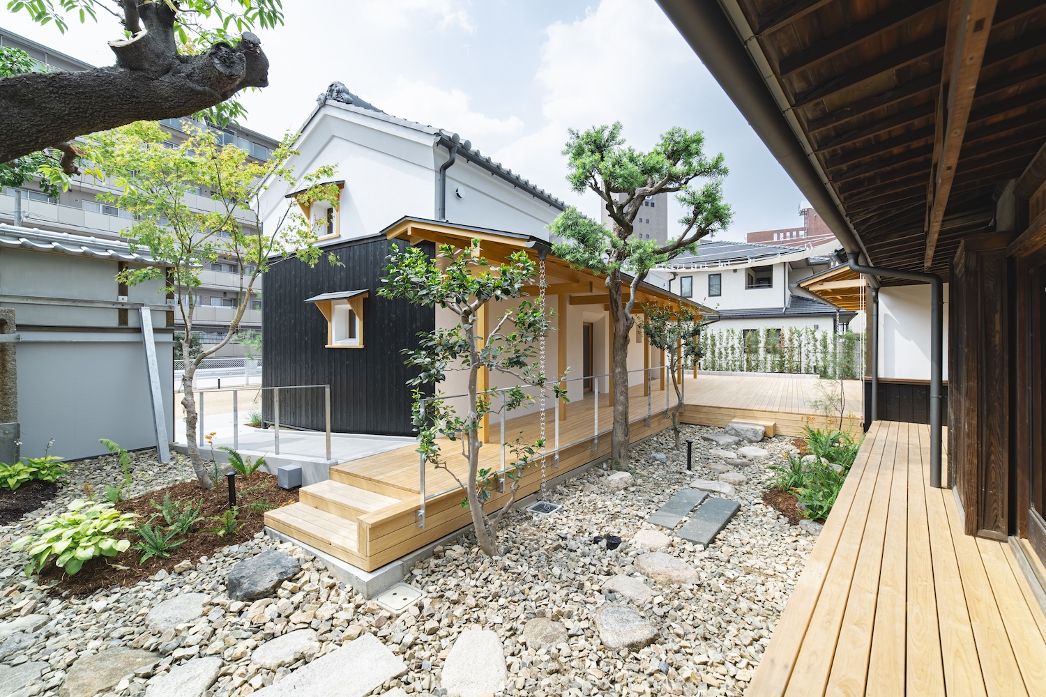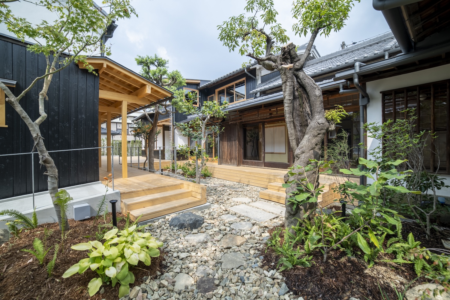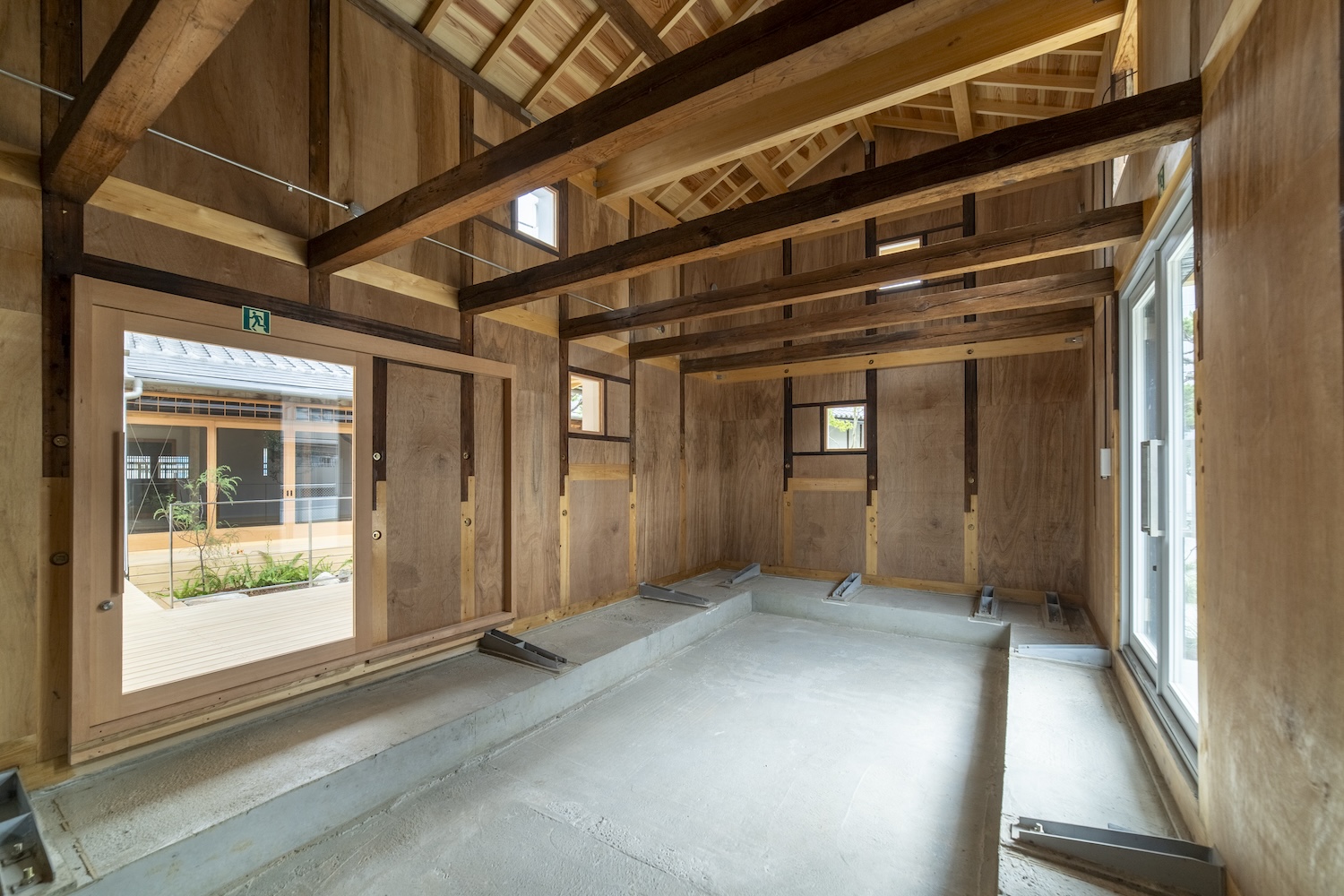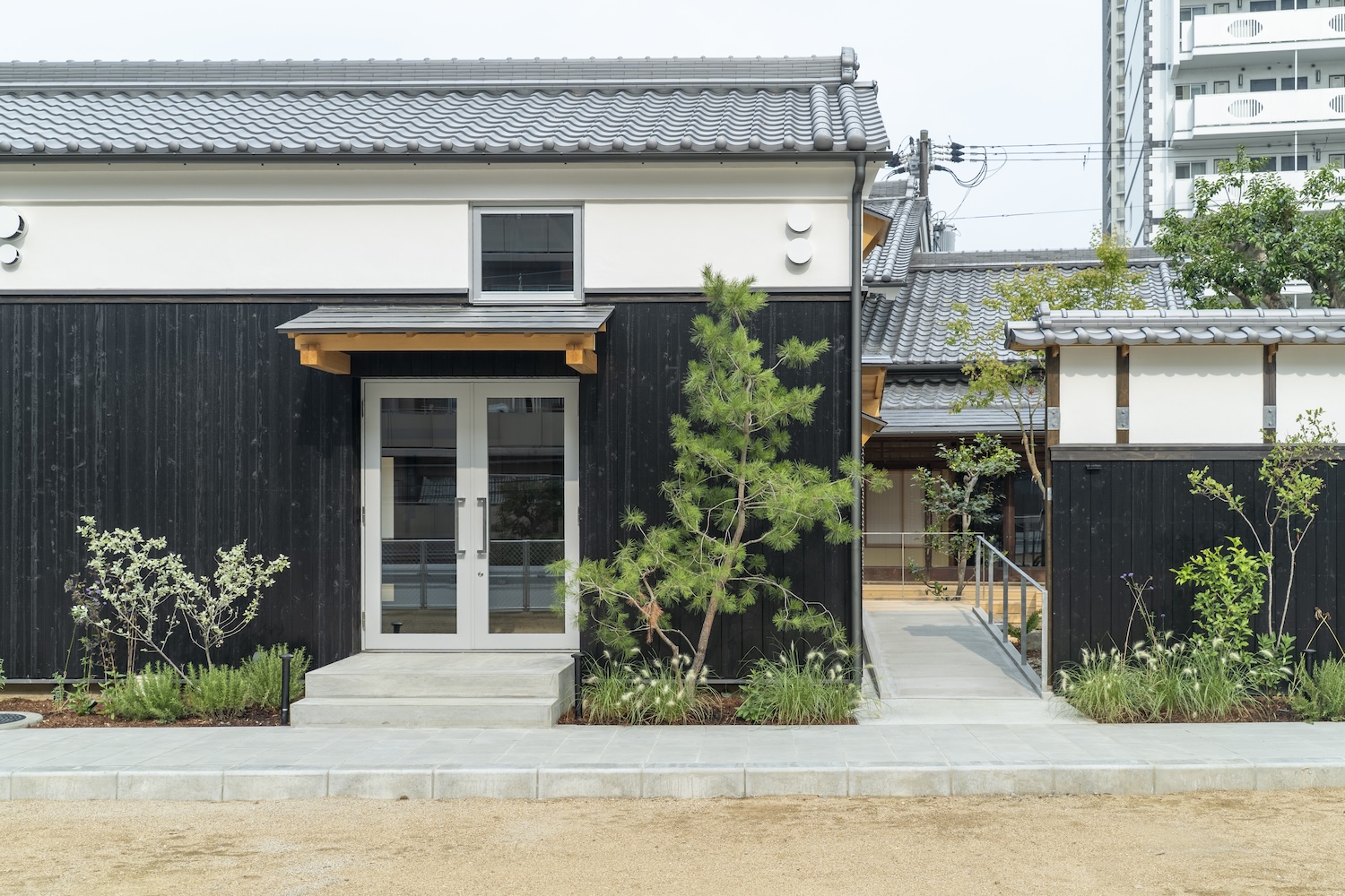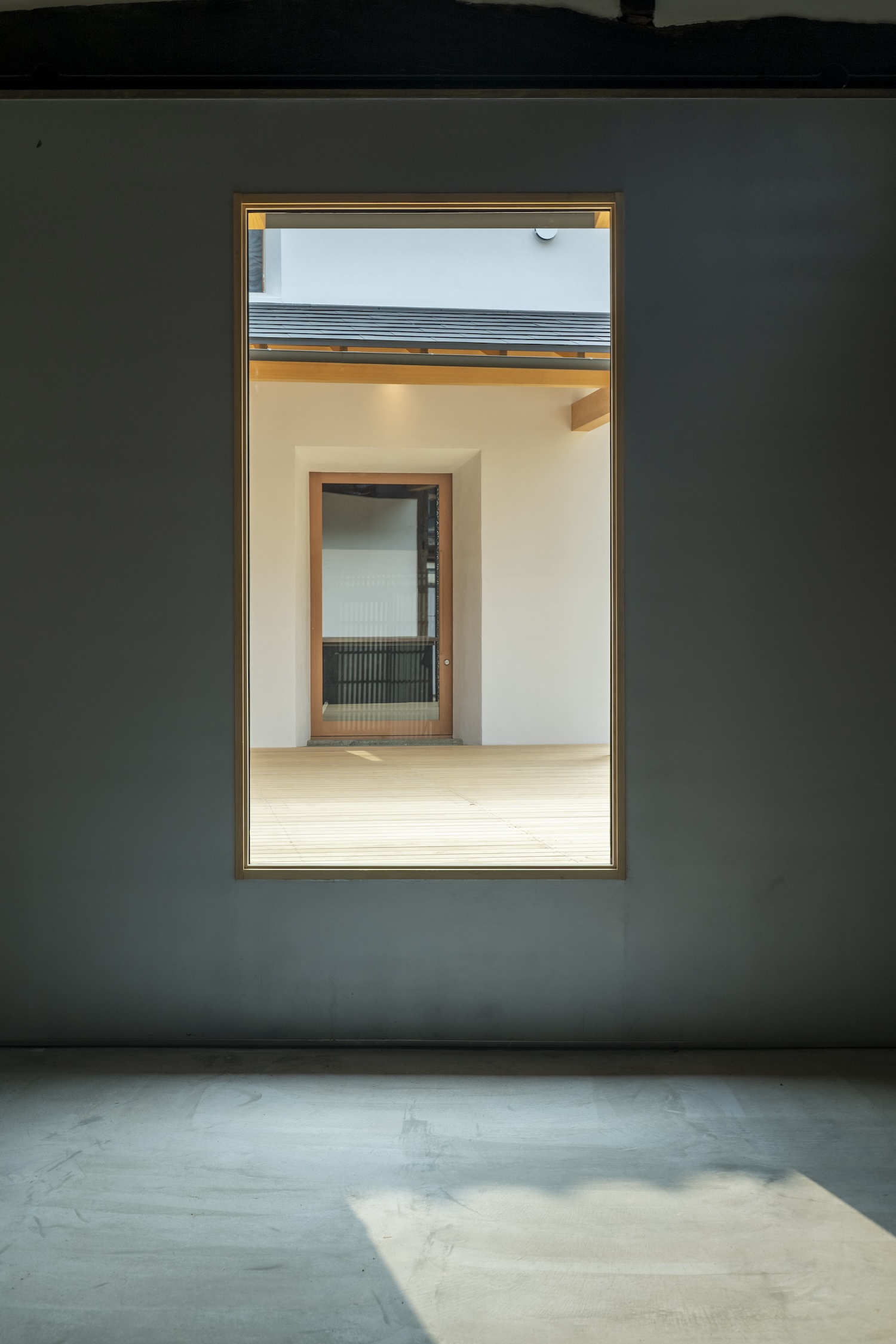 守口宿町家に特有な通し土間の再生や、庭へとつながる広縁の透明感を継承。玄関から土間、庭へと連なる視線の抜け等を新たな空間的価値として付加している。
